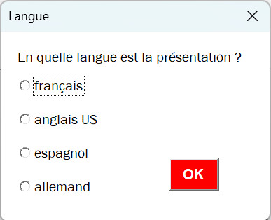 Ce fichier contient une macro avec un Userform permettant de choisir et/ou de modifier la langue de la présentation.