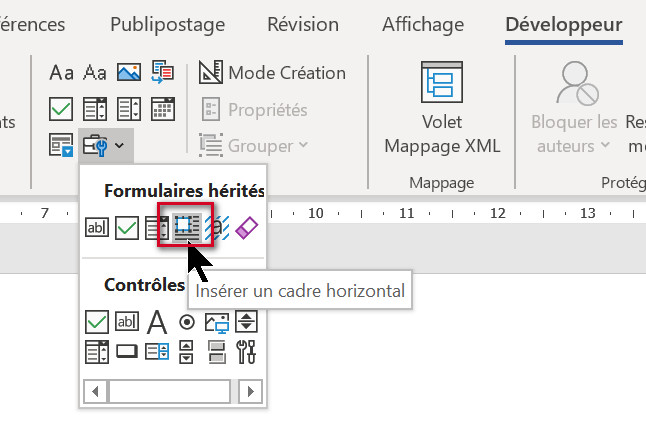 On peut encore utiliser ces cadres. Pour insérer un cadre : Onglet Développeur, groupe Contrôles, Outils hérités => Choisissez Insérer un cadre horizontal sous la rubrique Formulaires hérités. Le curseur prend l'aspect d'une croix : vous pouvez tracer le cadre dans le document.