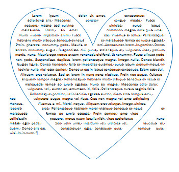 - Vous pouvez aussi insérer des formes avec habillage, dont le but est d'empêcher le texte de s'étaler. J'ai inséré des triangles dont la forme comble bien les vides laissés par le coeur. Pour que puissiez voir comment c'est fait, j'ai mis un fond coloré à ces triangles. Une fois les formes insérées, sélectionnez-les toutes tour à tour, puis sous l'onglet Format de la forme (ou Outils de dessin/Format selon votre version) groupe Organiser, cliquez simplement sur Habillage puis sur Modifier les points de l'habillage (les points se mettront tout seuls au plus près de la forme).