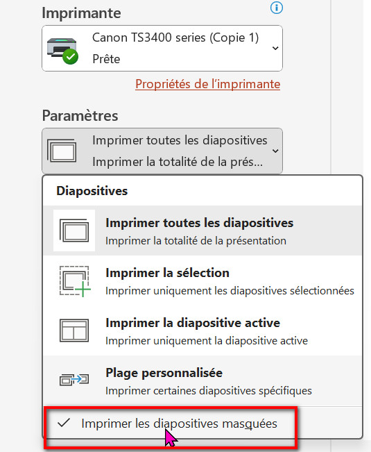 Ensuite, dans la boîte de dialogue d'impression il faut décocher l'option Imprimer les diapositives masquées.