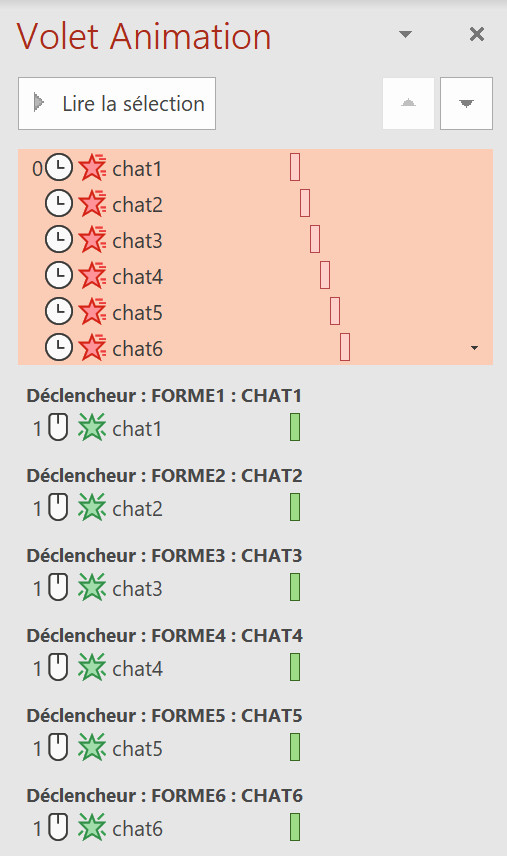 Arrivé à ce stade, chaque image est dotée de deux animations : une animation d'apparition qui ne se déclenchera que lors d'un clic sur une forme, et une animation de disparition (numérotée 1) qui ne pourra se déclencher que, bien évidemment, lorsque l'image aura d'abord été affichée. Il va donc falloir modifier l'ordre de ces deuxièmes animations afin que chaque animation de sortie suive l'animation d'entrée.