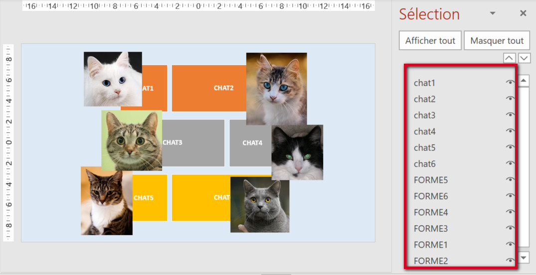 Pour simplifier l'opération, je vous conseille de nommer et de numéroter chaque élément de 1 à n ainsi que chaque image. Ainsi l'image Image1 s'affichera lors d'un clic sur la forme Forme1, l'image Image2 s'affichera lors d'un clic sur la forme Forme2, etc. Pour renommer vos objets, affichez le volet Sélection.