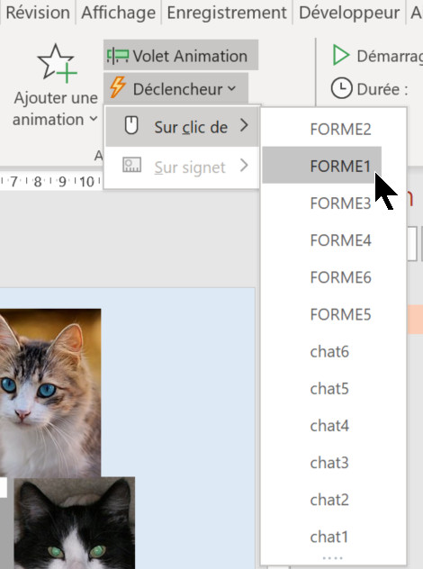 - Tour à tour, sélectionnez chaque image, cliquez sur la flèche déroulante du bouton Déclencheur, pointez sur Sur un clic de et choisissez le numéro de la forme correspondante.