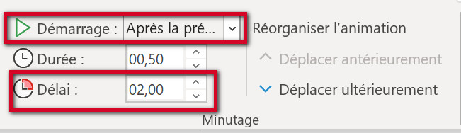 - Dans le groupe Minutage, choisissez à présent Après la précédente dans la liste déroulante Démarrage.