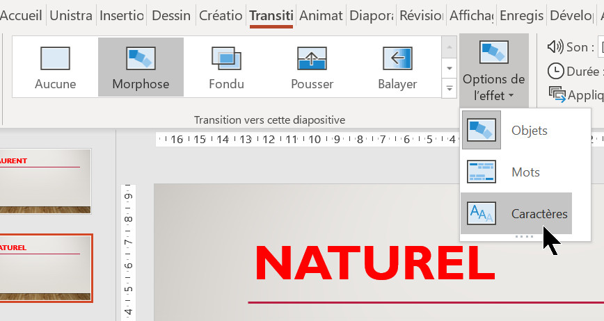 3. Restez dans cette deuxième diapositive, puis sous l'onglet Transitions, groupe Transition vers cette diapositive, choisissez la transition Morphose.