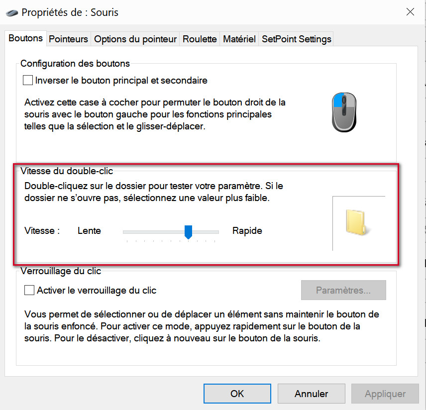 - Dans la boîte de dialogue Propriétés de la souris, onglet Boutons, rubrique Vitesse du double-clic, faites glisser le curseur légèrement vers la gauche pour diminuer cette vitesse.