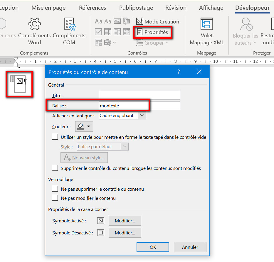 - Donnez un nom à la balise du contrôle. Ce nom sera le même que le nom de chaque bloc. Au texte "montexte" correspondra la balise "montexte", au texte "montexte2" correspondra la balise "montexte2", etc.