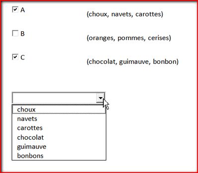 Si la case à cocher A est activée, la liste déroulante doit contenir les données A.