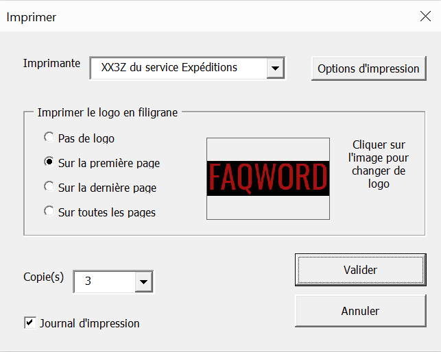 Un mot encore sur le code. L’essentiel en est la gestion des événements. Une fois ouverte et affichée, le UserForm doit réagir à un certains nombre d’actions de l’utilisateur. Ainsi cliquer sur le bouton OK est un événement. Par cette action on s’attend que le code valide toutes les données entrées et réalise le propos de la boîte de dialogue comme ici lancer une impression au moment de refermer le UserForm lui-même.