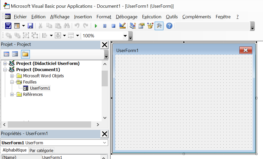 Un UserForm est une boîte de dialogue destinée à servir d’interface utilisateur personnalisée dans une application. Dans l’interface utilisateur Word, il existe déjà de nombreuses boîtes de dialogue (Police, Paragraphe, Mise en page, etc.).