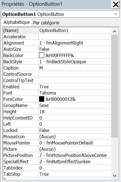 - Deux radio-boutons s’excluant l’un l’autre dans un contrôle Cadre par leur propriété (sexe du questionneur).