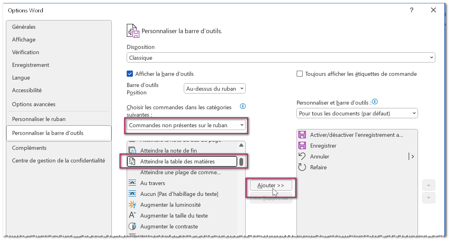 Cependant, la table des matières n'est pas forcément placée au début. Dans ce cas, la solution la plus simple est d'ajouter à la barre d'outils un bouton permettant d'accéder à la table des matières.