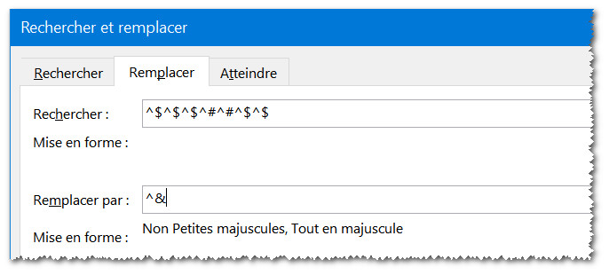 • Si le but est de remplacer les minuscules par les majuscules, il suffit, pour la zone Remplacer, d'ajouter le format "Majuscule" via la boîte de dialogue Format Police.