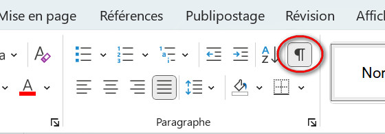 Les marques de format s'affichent avec le raccourci Ctrl+Maj+8 (du clavier alphanumérique) ou en cliquant sur le bouton en forme de pied de mouche ¶ et qui se trouve sous l'onglet Accueil, dans le groupe Paragraphe :