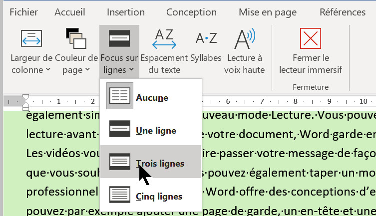 Le mode Focus Ligne permet un affichage par ligne, ou encore par trois ou cinq lignes, afin que l'œil du lecteur ne soit pas distrait par d'autres parties du document et qu'il se concentre sur la lecture ou relecture.