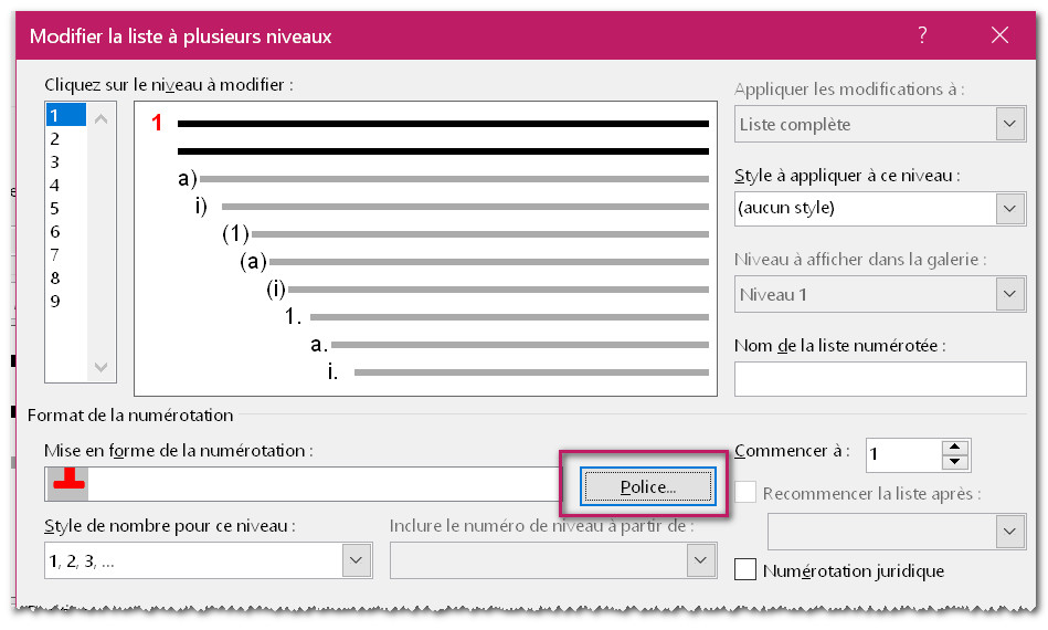 Il faut juste personnaliser sa numérotation hiérarchique en cliquant sur le bouton Police. Voir l'article à propos des listes hiérarchiques.