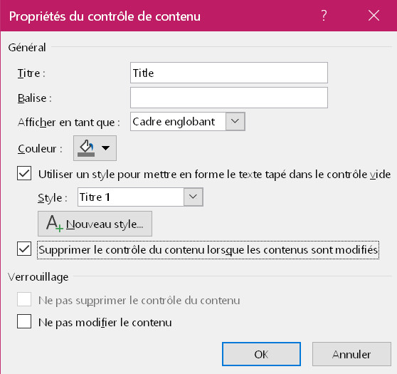• Cliquez sur Propriétés et choisissez le style Titre 1 pour le style à utiliser, et cochez l'option Supprimer le contrôle du contenu lorsque les contenus sont modifiés.