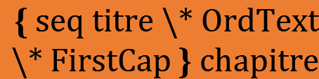 Pour insérer le numéro, sélectionnez le style Numéro, et entrez un champ SEQ comme ci-dessus, avec son identificateur et son format numérique, puis tapez le mot "chapitre" :