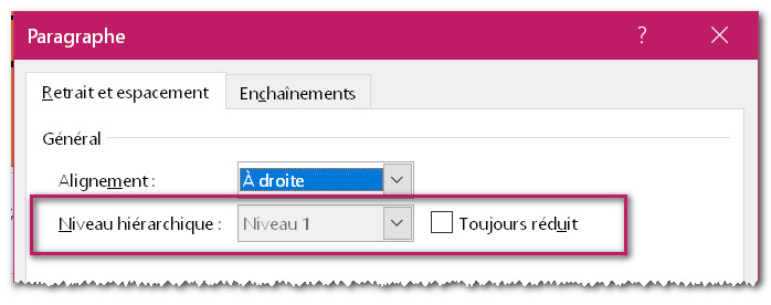 Le texte "Premier chapitre", "Deuxième chapitre", etc. est basé sur un style que j'ai nommé "Numéro" et il contient un format pour la couleur, la taille, etc. : ici fond orange, gros caractères, alignement à droite. Mais surtout, dans la boîte de dialogue Paragraphe, vous lui attribuerez un niveau hiérarchique 1.