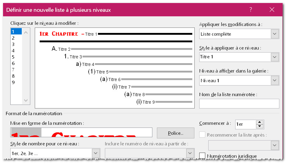 La première chose à comprendre est qu'il va falloir dissocier la numérotation du titre. Vous allez donc créer un modèle de numéro et un style de titre qui n'aura rien à voir avec le numéro.