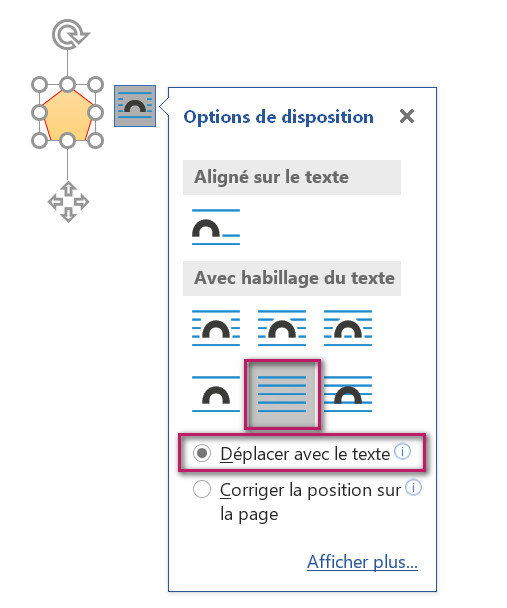 • Après avoir entré un titre, utilisez la boîte de dialogue Forme pour insérer l'objet qui vous convient, et appliquez la mise en forme qui vous plait du point de vue remplissage, contour, etc. Cette forme devra avoir un "habillage en-dessous". Donc sélectionnez la forme, cliquez sur le bouton des options de mise en page, cochez Derrière le texte, et impérativement cochez Déplacer avec le texte.
