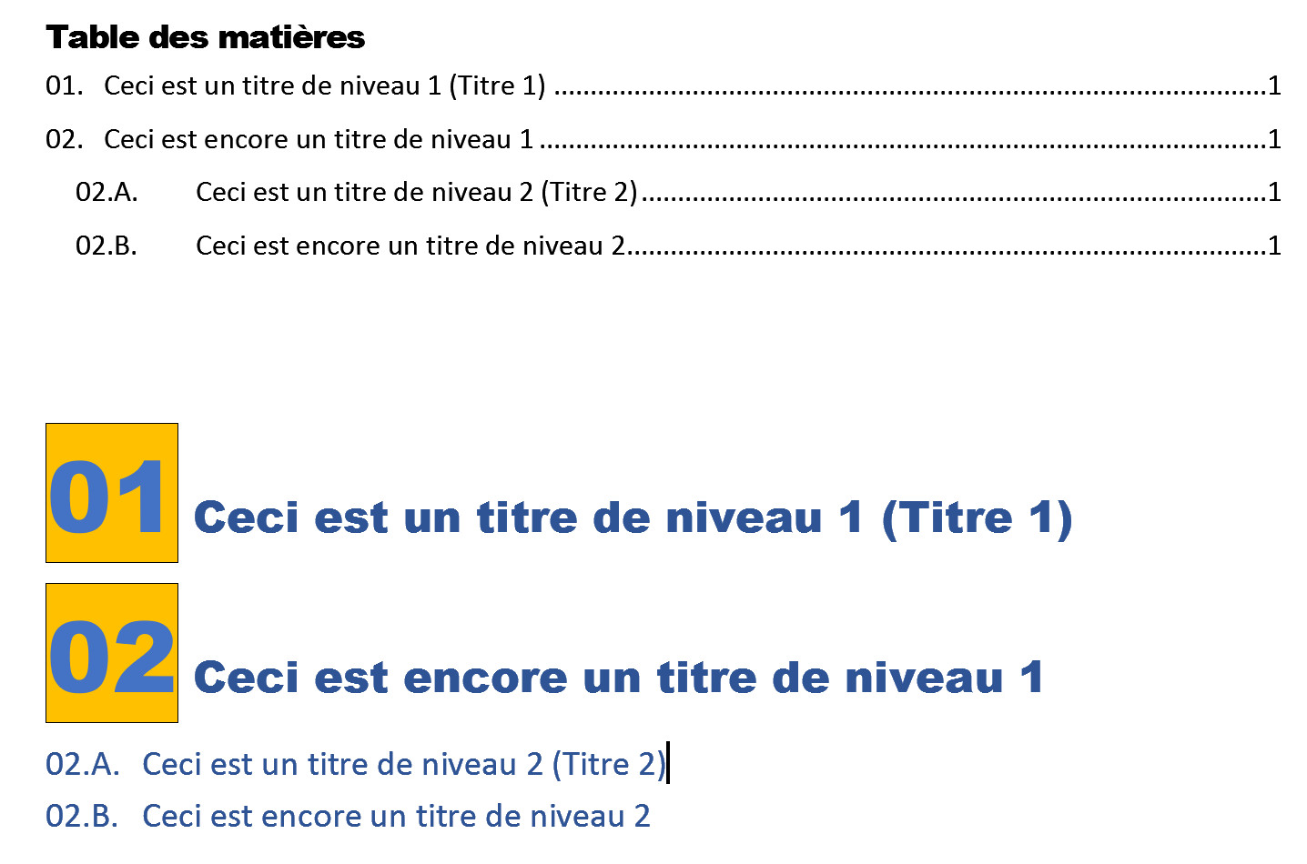 Dans les tous les exemples ci-dessus, la table des matières ne va pas poser de problème. Elle va reprendre la numérotation choisie. Si vous avez opté pour une autre police, une autre couleur, une autre taille, etc., seule la police différente sera respectée dans le sommaire. Si vous avez choisi d'insérer la numérotation sur une ligne seule, la table des matières ne tiendra pas compte de ces sauts de ligne, comme vous pouvez le voir ci-dessous.