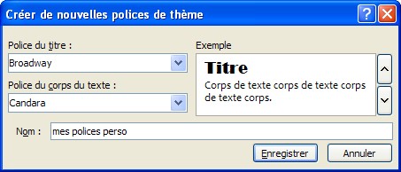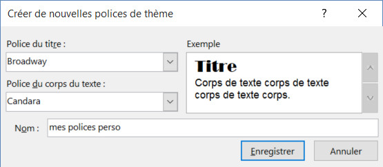 Si vous souhaitez, de plus, créer un thème à partir de votre propre jeu de couleurs et de polices, commencez par sélectionner vos deux jeux personnalisés, puis sous l’onglet Mise en page, groupe Thèmes, cliquez sur le bouton Thèmes, puis sur la commande Enregistrer le thème actif. Donnez un nom à votre thème et cliquez sur le bouton Enregistrer.