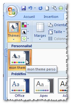 Les thèmes s’appliquent aux différentes applications Office et sont conçus pour fournir des documents homogènes, quelle que soit l’application qui a servi à les créer. Un thème est un ensemble de mises en forme qui gère les couleurs, les polices et les aspects des objets graphiques. Chaque jeu de styles peut être modifié indépendamment par un jeu de polices et/ou un jeu de couleurs. Les thèmes regroupent les deux, plus des effets graphiques.