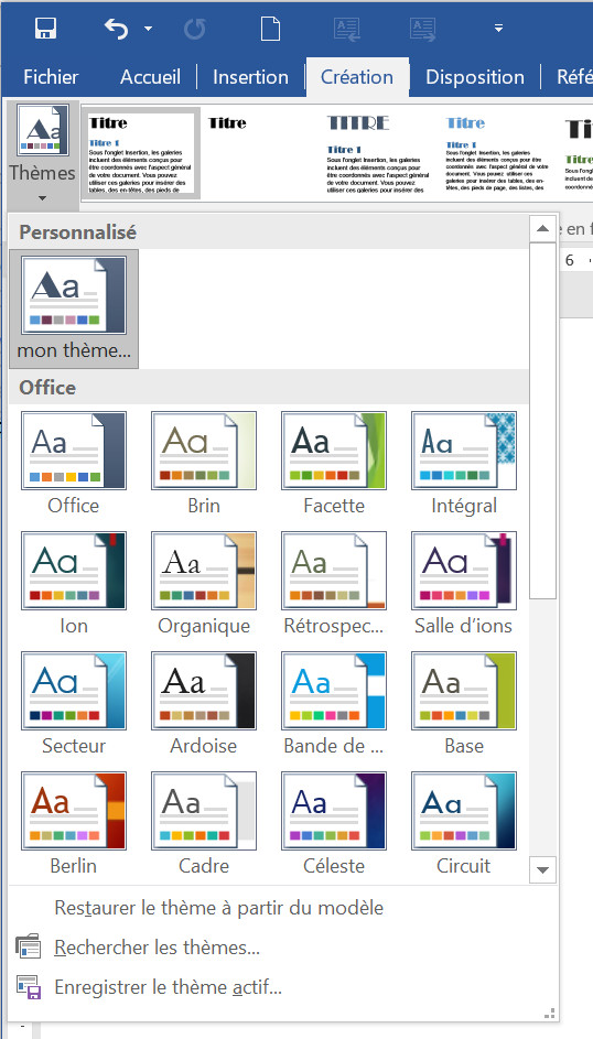 Pour utiliser les thèmes, allez sous l’onglet Conception (ou Création selon votre version), groupe Mise en forme du document. La galerie des thèmes s’affiche d’un clic sur le bouton Thèmes, et comme pour les styles, vous pouvez choisir indépendamment une autre série de couleurs ou une autre série de polices, mais aussi d’autres effets graphiques en utilisant les listes déroulantes correspondantes. Lorsque vous avez choisi un jeu de styles, il sera automatiquement conjugué avec toutes les variations des thèmes via la galerie des styles toujours sous l'onglet Conception (ou Création).