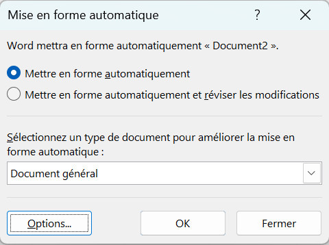 - Deux options s'offrent à vous : Mettre en forme automatiquement et Mettre en forme automatique et réviser les modifications. Les deux options mettront en forme automatiquement le document, mais la seconde permettra de réviser le document, de visualiser toutes les modifications, de les accepter ou de les refuser.