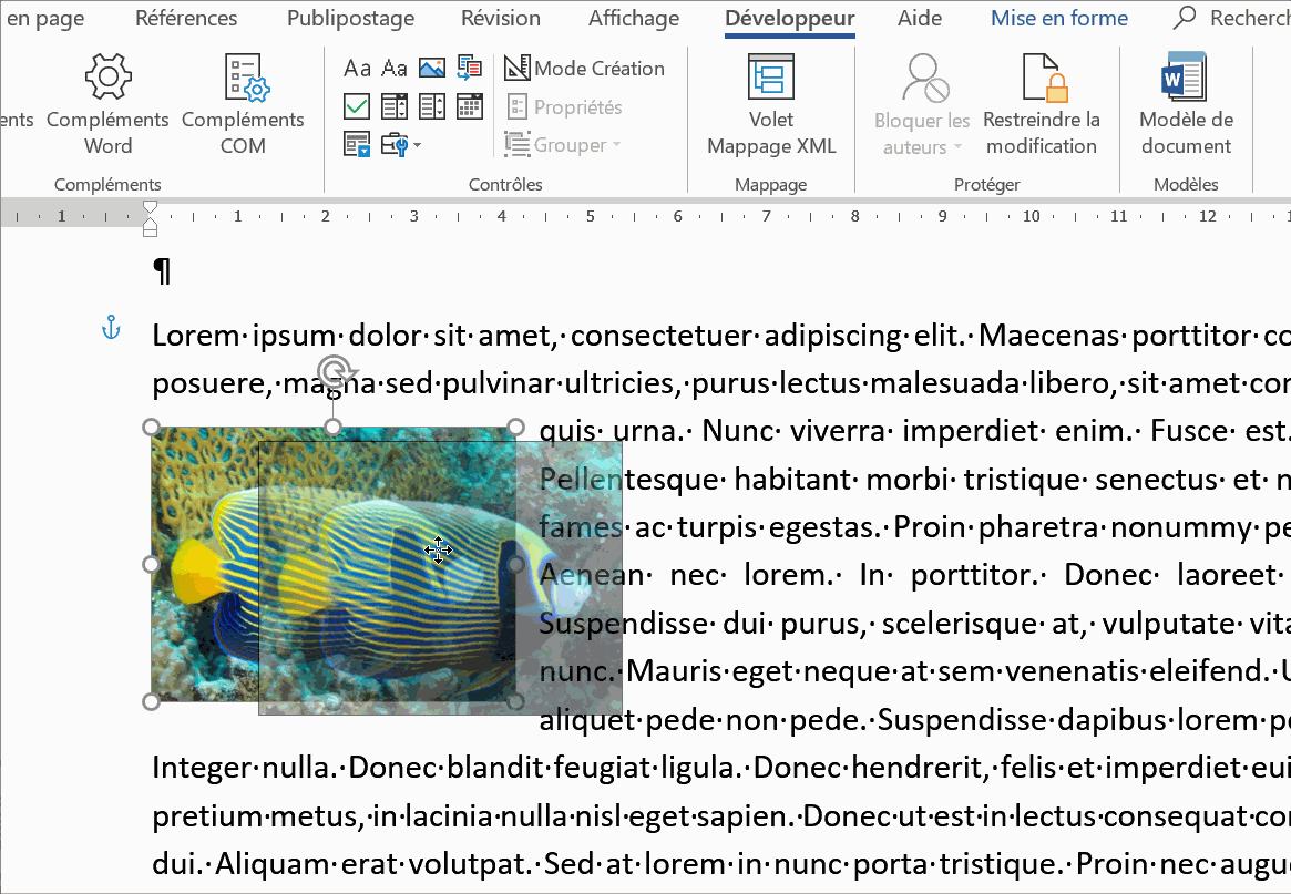 Voilà, à présent votre image est ancrée à l'endroit choisi sur votre page, elle ne pourra être ni modifiée ni déplacée. Il suffira de faire l'inverse pour procéder à des modifications (bouton Grouper => Dissocier)