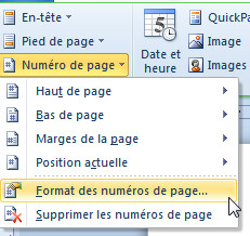 - Sous l'onglet Outils En-têtes et pieds de page/Création, groupe En-tête et pied de page, cliquez sur le bouton Numéro de page, puis sur la commande Format des numéros de page, et choisissez l'option A partir de 1 sous la rubrique Numérotation des pages.
