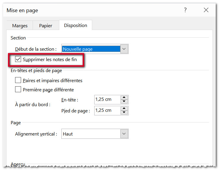 Cliquez dans la première section de la partie et affichez la boîte de dialogue Mise en page. Sous l'onglet Disposition, cochez l'option Supprimer les notes de fin et cliquez sur OK. Recommencez l'opération pour la deuxième section.