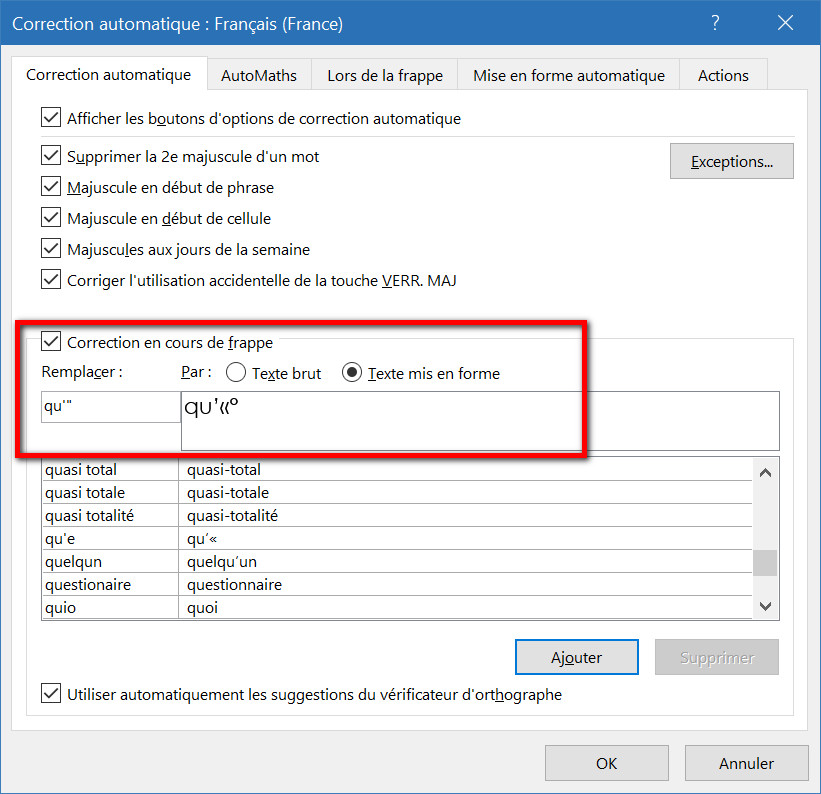 - Affichez les options de correction automatique : Onglet Fichier => Options = Vérification => Bouton Options de correction automatique, onglet Correction automatique.