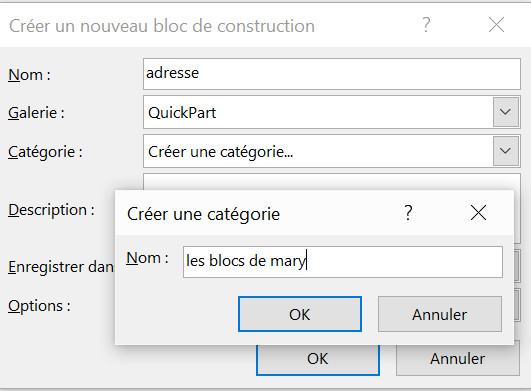 Dans la boîte de dialogue Créer un nouveau bloc de construction, vous choisirez, entre autres :
