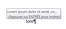 NB : Pour les versions à partir de 2010, lorsqu'un bloc de construction est inséré dans la galerie des insertions automatiques, Word affiche une suggestion de saisie automatique après avoir saisi les 4 premiers caractères du nom (comme cela existait dans les versions anciennes). Il suffit alors d'appuyer sur la touche Entrée :