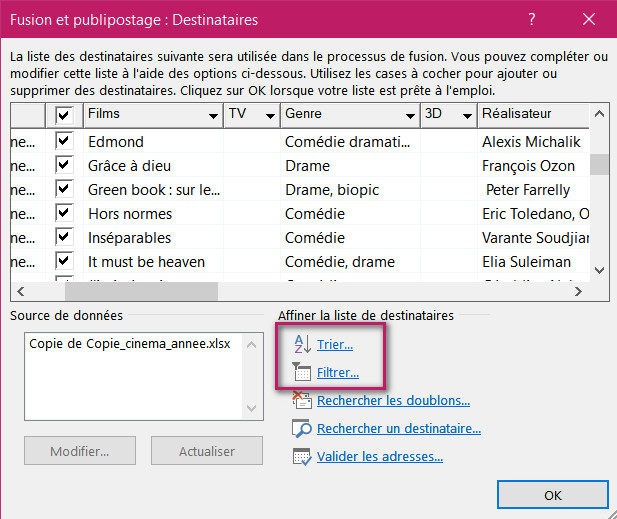 Si vous exécutez régulièrement ce publipostage, avec toujours le même tri et toujours le même filtre, cette macro n'a pas non plus d'intérêt. Il suffit de cliquer sur Modifier la liste de destinataires, puis d'utiliser les fonctions Trier et/ou Filtrer. Vos choix seront conservés avec le document principal de fusion.