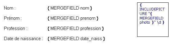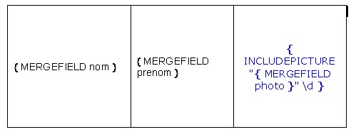 Vous devez entrer le champ { INCLUDEPICTURE } contenant lui-même le champ { MERGEFIELD }.