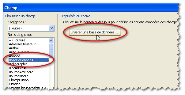 Onglet Insertion, groupe Texte, Bouton QuickParts, Champs, choisir BaseDeDonnées, puis cliquer sur le bouton Insérer une base de données