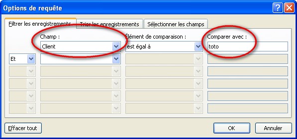 - Sous l'onglet Filtrer les enregistrements, choisir le champ Client (selon notre exemple) égal à : taper un mot quelconque, "toto" par exemple.
