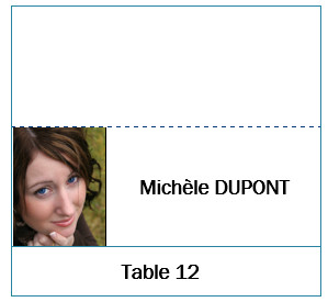 Voici par exemple un modèle d'une étiquette de table pliable qui comporte le nom, le numéro de la table, et une photo :