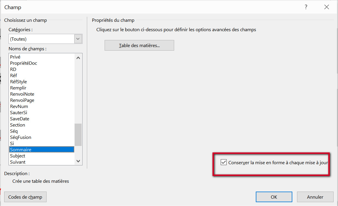 Dans la boîte de dialogue Champ, sélectionnez le champ Sommaire dans la liste gauche, et vous verrez cette option cochée par défaut. Elle est cochée par défaut pour tous les champs sauf le champ REF. Cette option ajoute le commutateur \* MERGEFORMAT dans le champ.