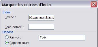 Pour reprendre mon exemple avec "Jimi Hendrix", vous pouvez décider de tout répertorier sous Hendrix. Dans ce cas, dans la boîte de dialogue Marquer les entrées d'index, cochez l'option Renvoi, et tapez "Hendrix" dans la zone correspondante. Par défaut, le mot Voir est déjà saisi.