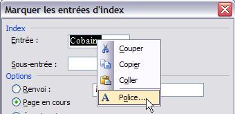 - Si vous souhaitez donner au texte de l'index une mise en forme particulière, cliquez dessus avec le bouton droit dans la zone Entrée (ou sous-entrée), et cliquez sur Police, puis sélectionnez la mise en forme de votre choix. Vous remarquerez que, dans ce cas, il n'y a pas de commutateurs particuliers, c'est tout simplement le texte de l'index qui prend le format souhaité ; cela revient à dire que vous pouvez très bien sélectionner le texte une fois l'entrée d'index marqué et modifier les attributs comme vous semble.