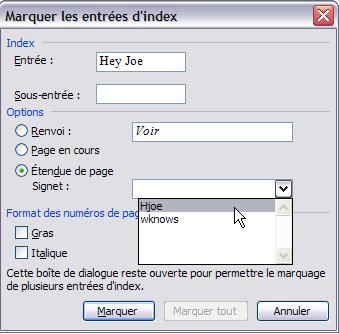 - Appuyez sur les touches Alt+Maj+X pour faire apparaître la boîte de dialogue Marquer les entrées d'index.