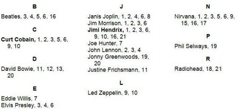 Dans l'index, nous aurons donc, classé à la lettre J "Jimi Hendrix", avec l'annotation : "Voir Hendrix".