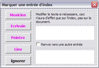 - un bouton de commande qui correspondra à chacun des types d'entrée que vous souhaitez pour votre index (dans notre exemple, on a mis "Musicien", "Ecrivain", "Peintre" et "Lieu"