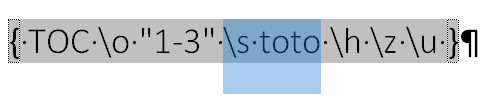 • Insérez votre table des matières normalement puis affichez le code du champ. Pour cela, appuyez sur le raccourci clavier Alt+F9.