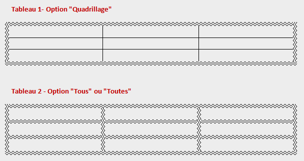 Pour voir la différence, il faut choisir un "style" sophistiqué (autre qu'un simple trait continu). On voit alors que avec "toutes", chaque cellule est bordée avec le style choisi. Avec "quadrillage", seul l'encadrement est bordé avec le style choisi, alors que les autres cellules sont délimitées par un simple trait (d'où l'aspect "quadrillage" du tableau).